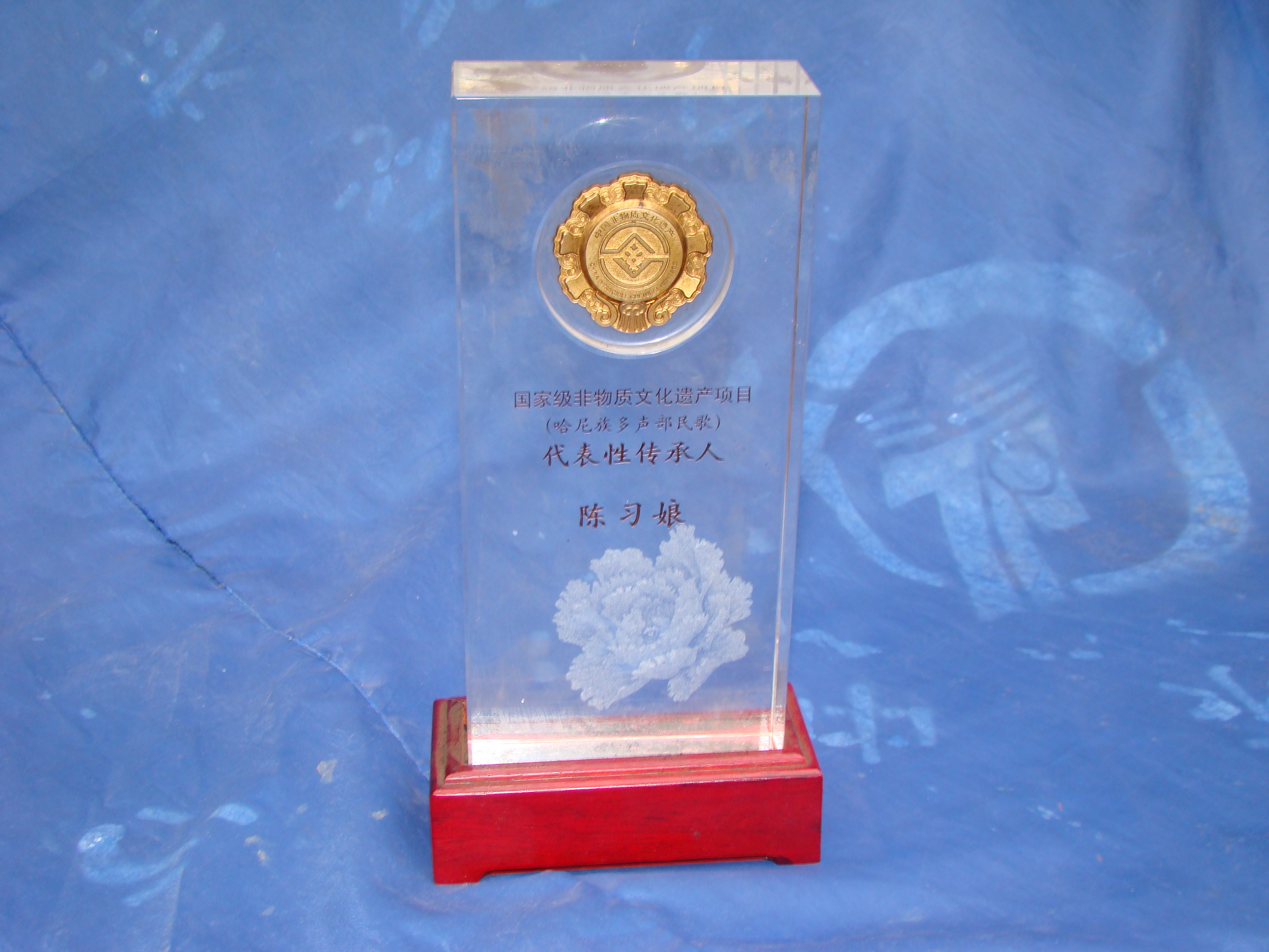 1989 年,参加哈尼族多声部合唱在昆明为“世界文化考察团”展演;1997 年参加红河县哈尼族民间艺术团到海南宣传展演;2000 年参加红河民间文化表演团到香港、台湾开展文化交流活动;2003 年参加中央电视台西部民歌大赛;2003 年被红河州文化局、州民族事务委员会授予“民间音乐艺人称号”。2008 年 2 月被评为国家级非物质文化遗产代表性传承人。陈习娘的传承活动在当地具有广泛的影响,获得许多国内外专家的赞扬和认可。他还带出了多名优秀的徒弟,为哈尼族多声部民歌的传承和发展做出了重要贡献。