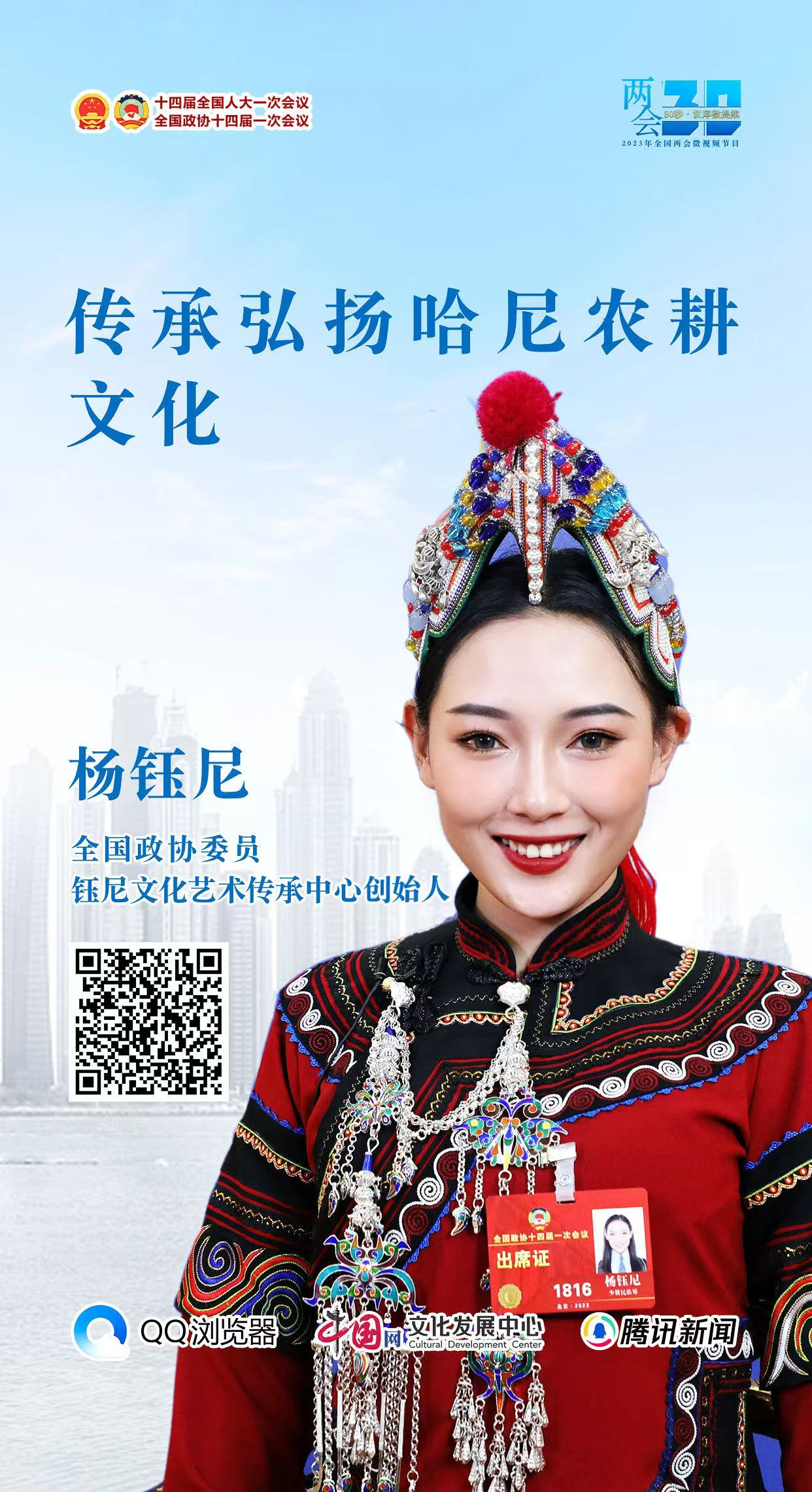 2023年5月参与CCTV1《非遗里的中国》——非遗正年轻系列节目,直播哈尼梯田农耕文化、歌舞文化以及在节目现场展示哈尼古歌、乐作舞等非物质文化遗产。
