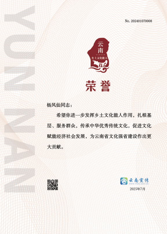 杨凤仙来自安宁市,2019年加入安宁市禄脿社区文化文艺队,参加过春节踩街、艾家营葡萄节文化舞蹈比赛等社区组织的文艺演出,在安宁广场舞舞蹈比赛并获得第二名。她拥有扎实的文化基础知识和舞蹈功底。具备较强的团队合作精神。