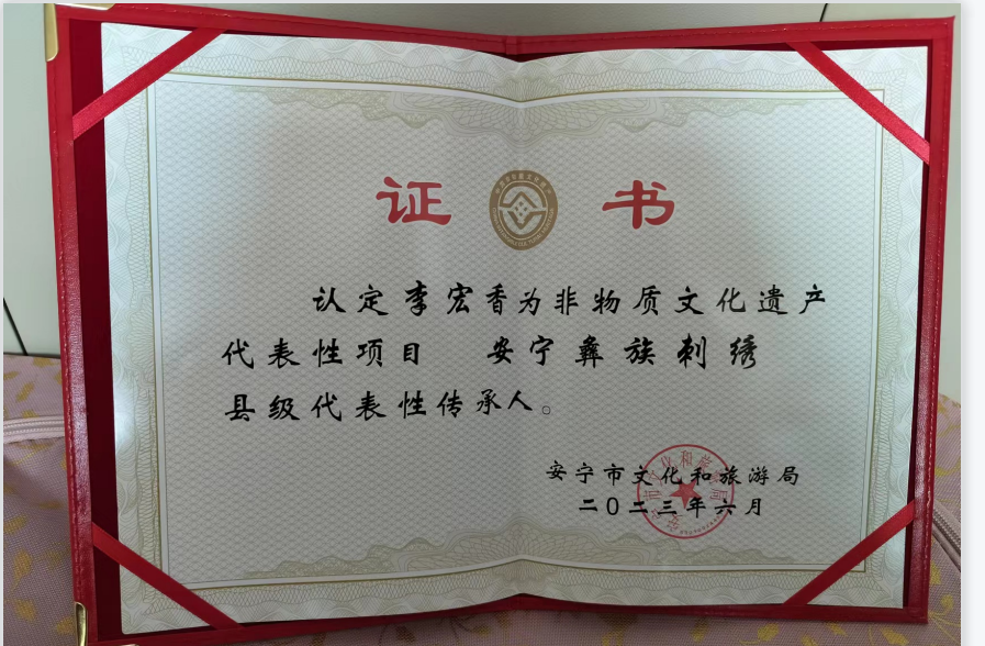 李宏香是非物质文化遗产代表性项目安宁彝族刺绣县级代表性传承人。