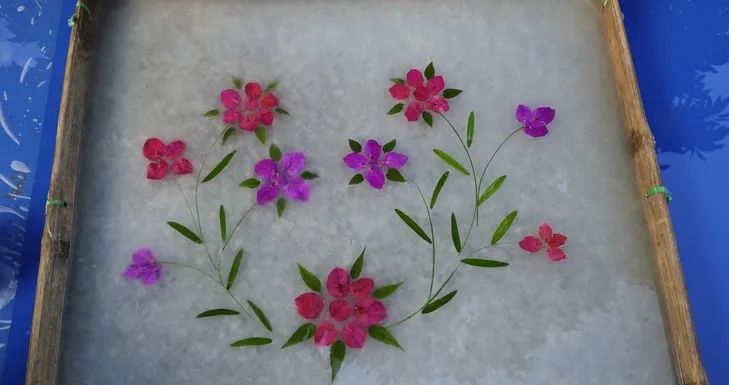 将纸帘放入纸槽,荡料入帘;搅拌轻拍,花朵和树叶拆散重组;提起帘子、滤去水,翻扣在晾晒板上,经过阳光的炙烤,那些植物便在傣族手工造纸中以另一种鲜活的形式延续下去。