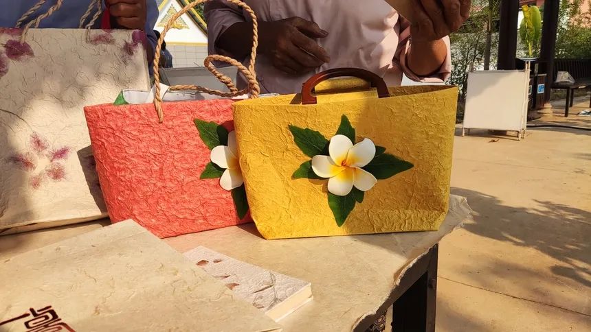 一开始的造纸仅用来抄录经书,销路少。后来金小页的徒弟金美特地到耿马县学习制作文创产品,并把手艺带了回来。现在除了传统的白棉纸,还有白棉纸制作的手提包、台灯、扇子、书签、笔记本、墙纸、簸箕、花纸,并可用作书法纸、画纸、茶叶包装纸等等,大大拓宽了市场。并且将造纸纳入到旅游景区——忙石寨文化产业园中,游客可观摩造纸制作过程、购买造纸文创品。