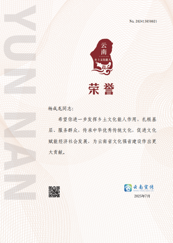 杨成龙在大学毕业后协助“宁蒗县摩梭传统手工纺织厂”和“手工纺织合作社”注册商标和十二个传统图案版权;手工纺织厂生产的手工围巾和披肩畅销丽江各大景区,于2006年-2010年间带动温泉15个村妇女就业,目前还有45位妇女从事手工纺织,2020年,“摩梭手工围巾”荣获“2020中国特色旅游商品大赛”入围奖;2022年,“摩梭手工围巾”入选2022年云南省首届“非遗伴手礼”。2010年-2016年杨成龙协助“宁蒗县非遗中心”成功传承17类市级、省级非物质文化遗产并邀请17位非遗传承人参加传承活动;并于2016年申请成立了“宁蒗县阿七独支玛摩梭非遗博物馆”“非遗馆”位于丽江市宁蒗县永宁镇温泉村委会瓦拉壁村,“非遗馆”于2017年成立了“永宁镇摩梭手工业和农业联合党支部”,党支部于2019年12月被中共丽江市委组织部评为“‘丽江先锋’示范点”、2021年6月被宁蒗县委组织部评为“宁蒗县先进基层党组织”、2023年、被评为“丽江市两新组织“党建强、发展强”示范党组织”。