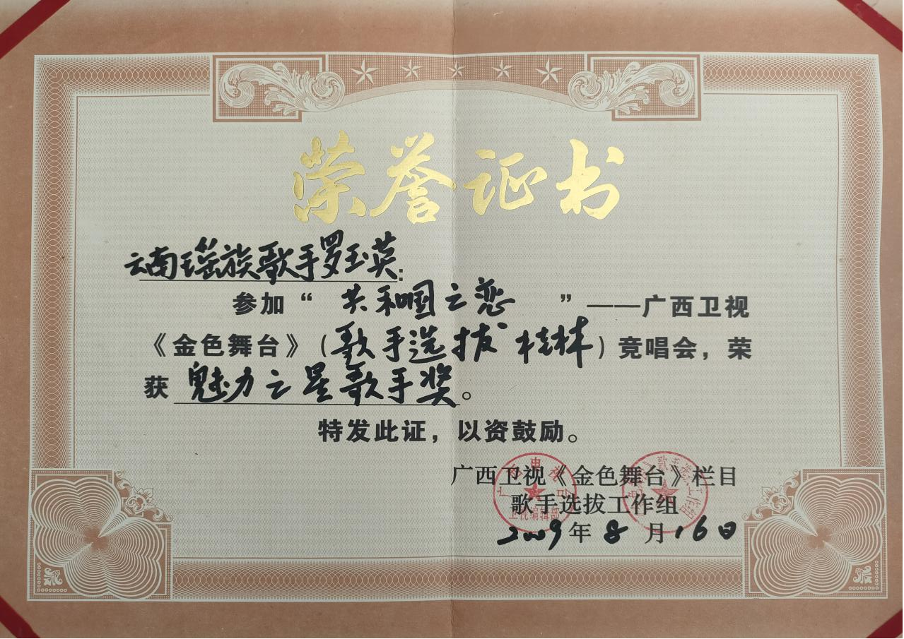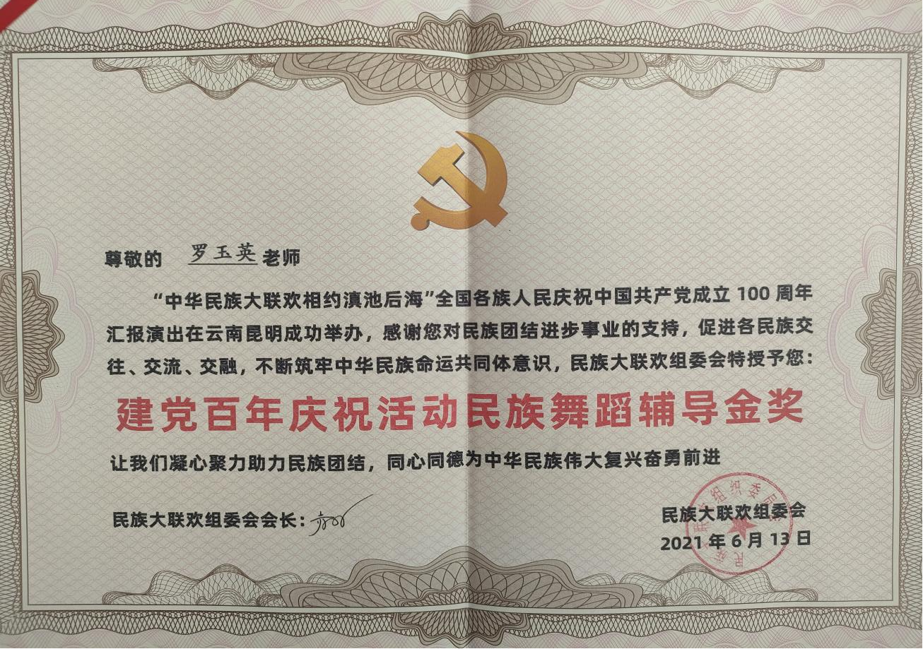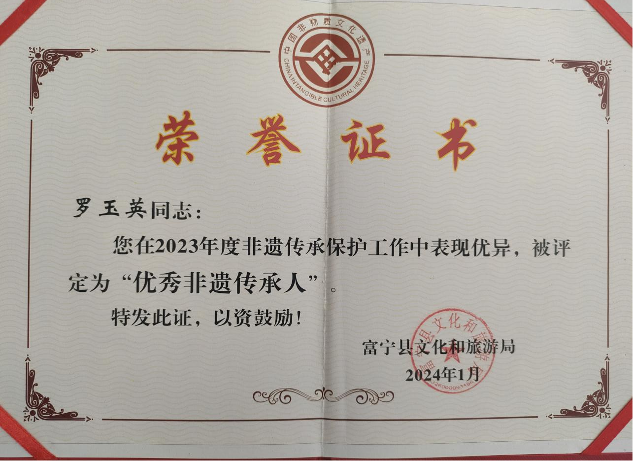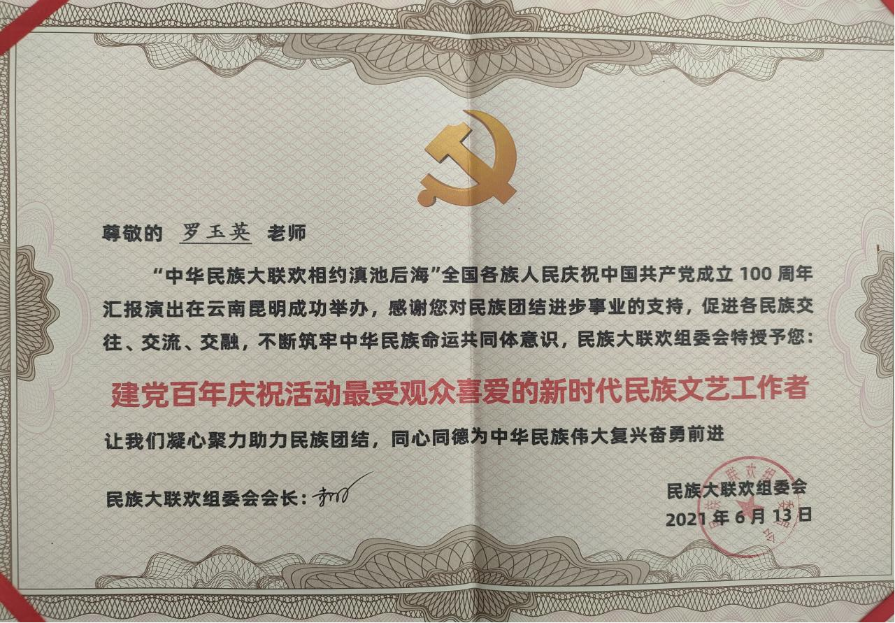 1972年广南县召开三级干部会议,要求革郎村出一个盘王舞的节目,当时革郎小学老师赵开堂就要求有男女演员参加,从此以后盘王舞就男的女的都可以跳,罗玉英参加了随即成立的“革郎业余文艺宣传队”。1982年出嫁到富宁县新华镇安兰村。1991年安兰村组建“安兰社教文艺宣传队”,并于同年10月份参加全县农民业余文艺汇演,由罗玉英编排的的舞蹈《盘王舞》《绣花包》分别荣获表演二等奖和优秀表演奖。此后,罗玉英与盘王节结下了不解之缘。1997年6月参加云南省首届中国国际民族服装服饰傅览会;2003年参加贵州省黔西南布民族民歌节个人演唱一首《瑶家姑娘绣花苞》;2010年8月罗玉英组织建立“富宁县瑶族协会民间艺术团”并担任团长。多年来,经常参加县级各种大型文艺晚会,排练节目开场舞,每年陇端节活动,在本村举办瑶族盘王舞和山歌非遗传承培训班,学员达200余人,深受广大群众喜爱。2023年9月参加红河州河口县瑶山乡举办云南省民歌交流会;同年10月参加文山州瑶族盘王节活动,演唱《赞盘瓠》;同年11月参加红河州河口县瑶族盘王节活动。2024年8月参加云南省民族服饰刺绣传承人培训班学习。2021年4月被评为文山州瑶族盘王节非遗传承人。