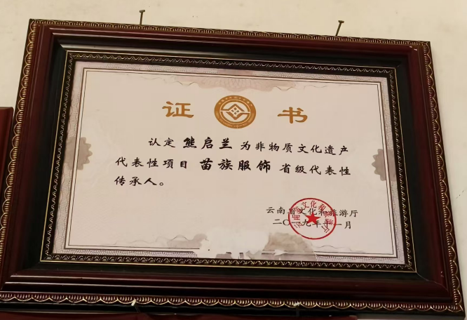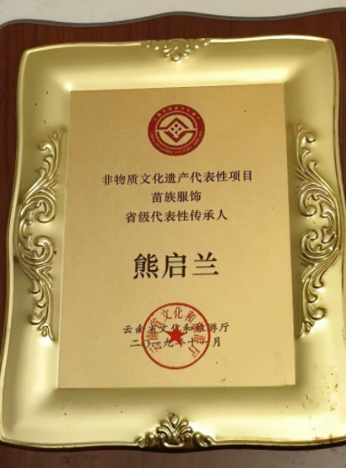熊启兰自幼爱好民族文化,热衷于民族服装的设计和制作,从小跟随母亲学习和制作苗族服饰,刺绣和蜡染多次受到周边至外省的认可和赞扬,也多次参加比赛荣获多项荣誉。目前被评为非物质文化遗产代表性项目苗族服饰省级代表性传承人。2014年,被列为昭通市苗族服饰代表性传承人,2017年,参加昭通市民间刺绣蜡染分别为一等奖和优秀奖,2019被评为省级民族服饰代表性传承人,期间多次参加全国各地的培训和接待及服装展示。2020年到2024年期间,公益接受威信县各小学及中学来访学习和培训多次。